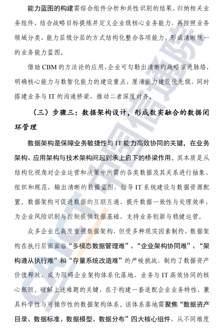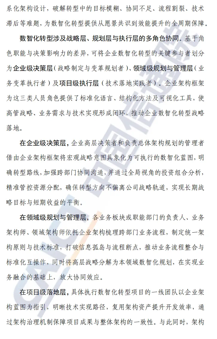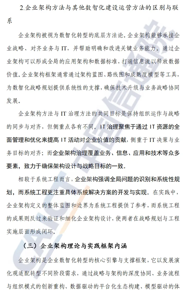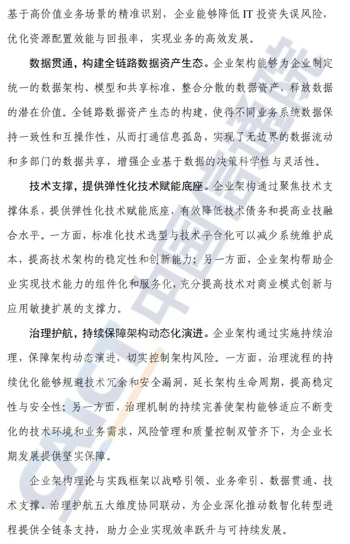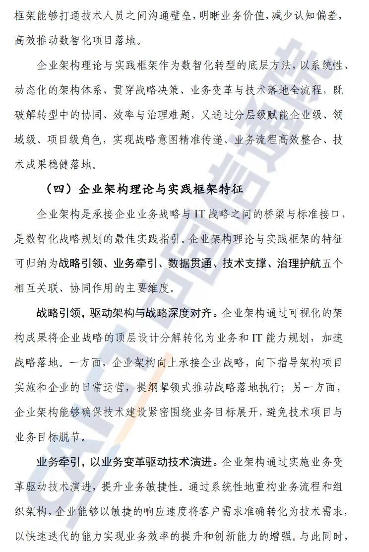 报告对企业架构的定位明显超越“技术蓝图”层面,而是把它作为数智化转型的底层方法体系。