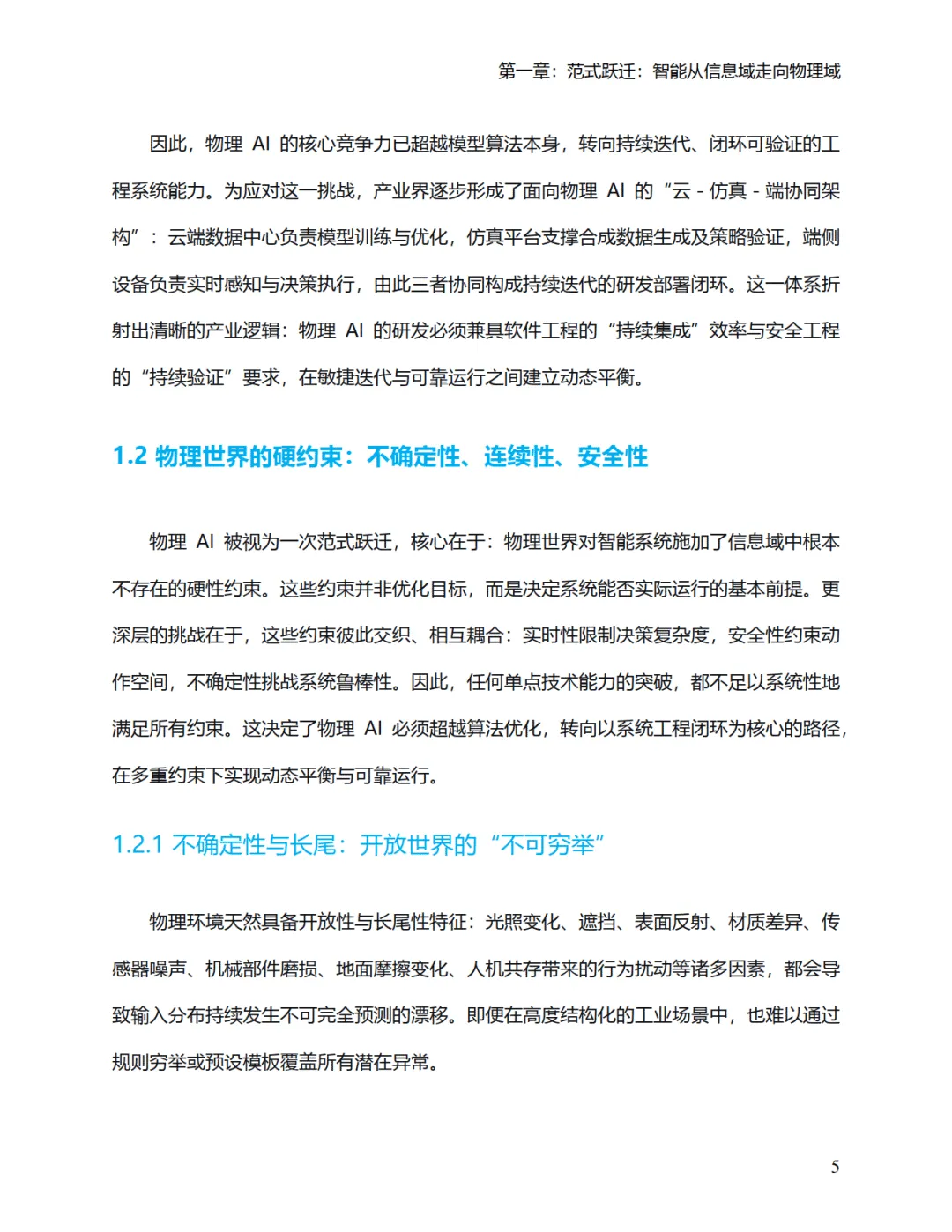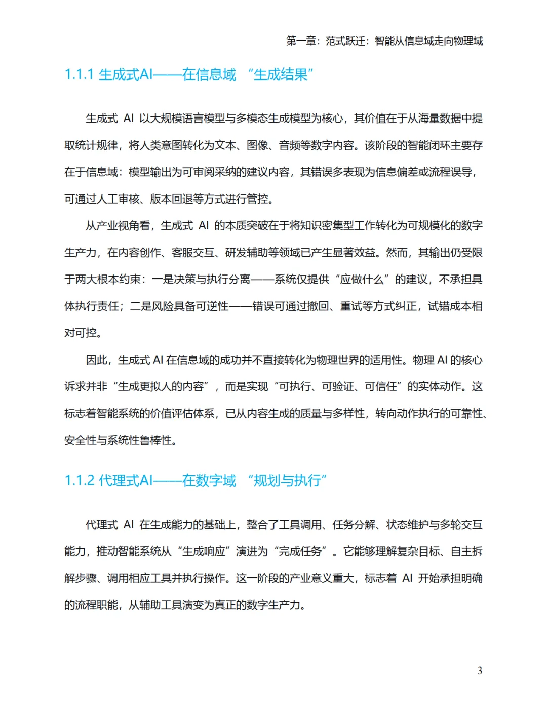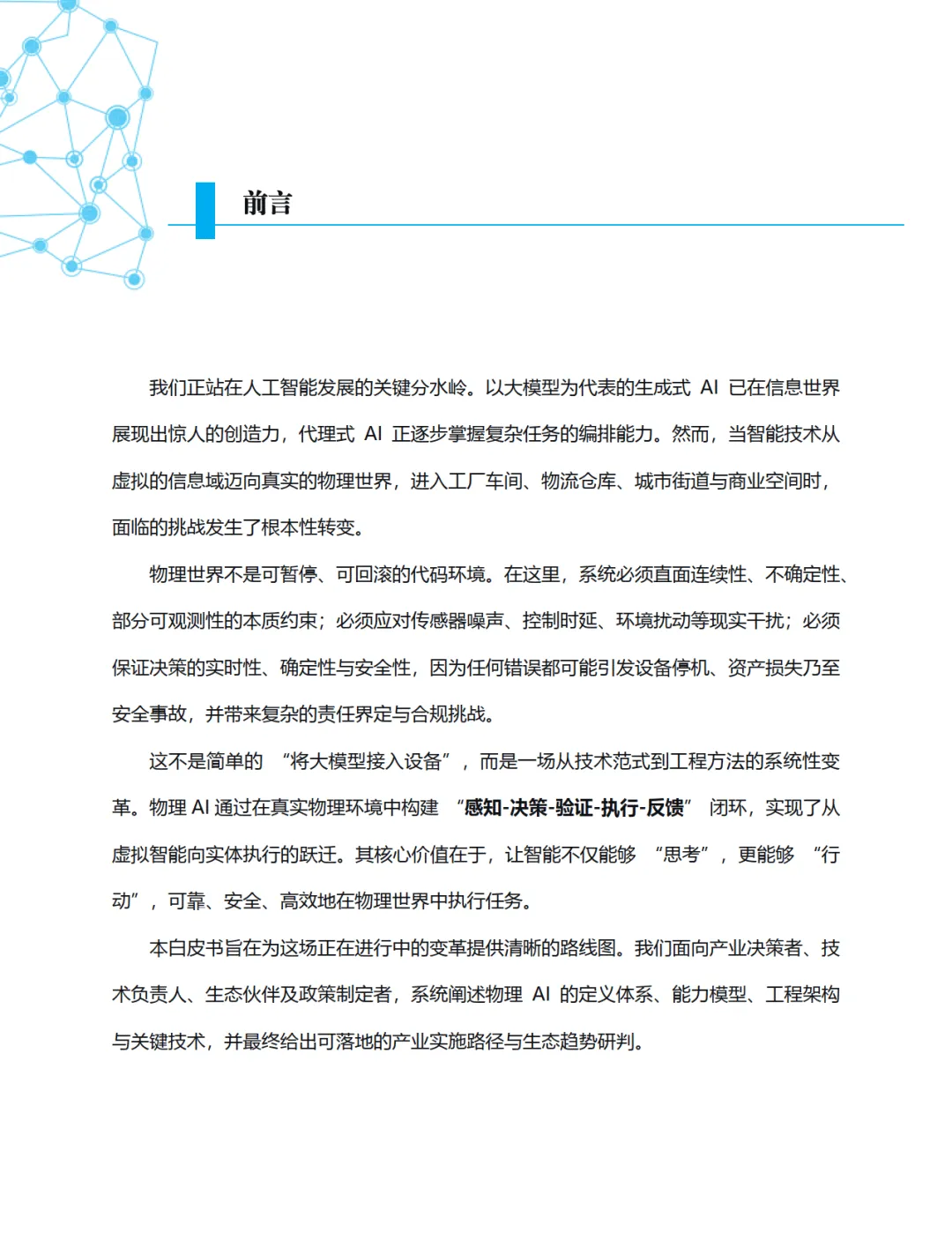 2026 年 2 月发布的《物理 AI 白皮书:迈向可执行的机器智能》由上海仪电牵头编制,系统阐述了物理 AI 的技术体系、产业路径与发展趋势,指出物理 AI 是人工智能从信息域走向物理域的范式跃迁,标志着智能技术进入可执行、可验证的实体智能新阶段,未来 1-3 年是其从技术验证走向规模化部署的战略窗口期。
