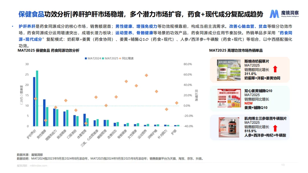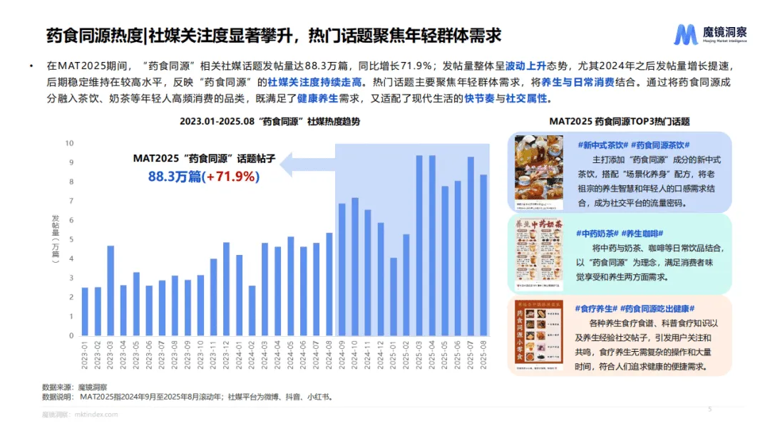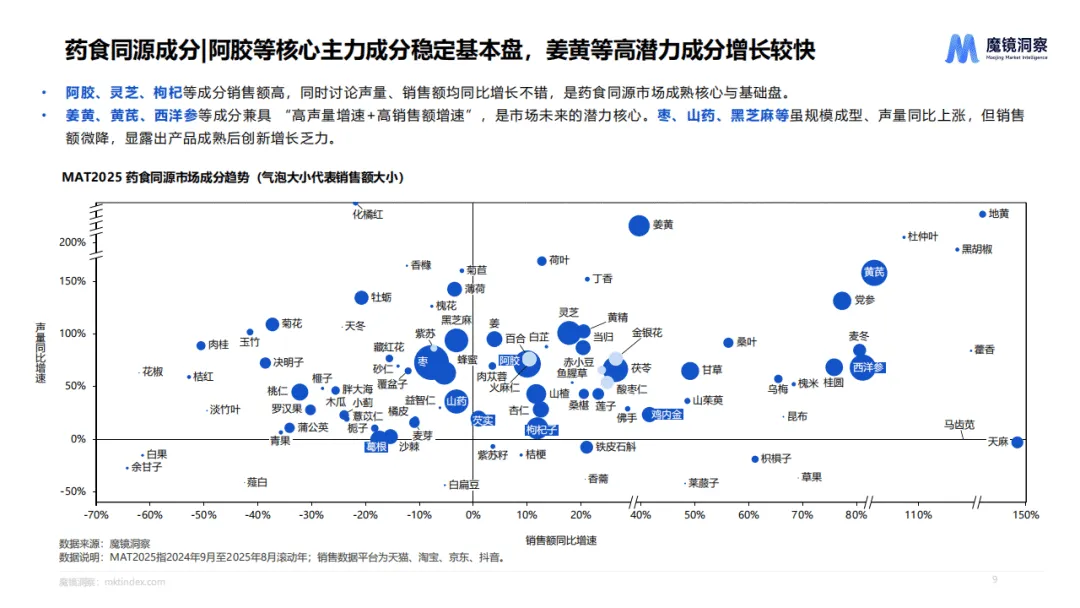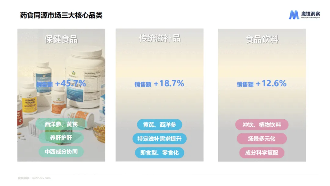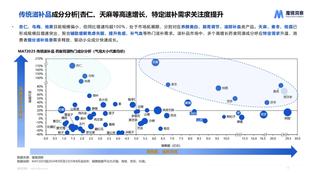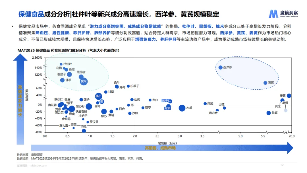 2025年12月魔镜洞察发布的药食同源市场趋势报告显示,国内消费者亚健康、睡眠不佳等健康困扰凸显,养生需求持续释放,为药食同源市场带来强劲发展动力,该市场呈现规模扩容、消费多元、产品创新的显著特征。