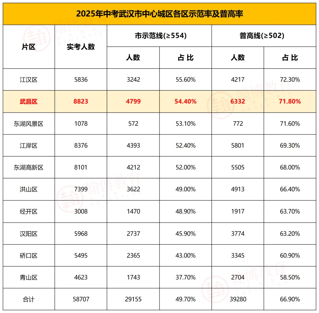 武昌作为武汉中心城区实打实的生源大户,2025年中考实际参考人数高达8823人,比江汉区多出近3000人。即便在如此庞大的考生基数下,整体升学成绩依旧格外亮眼,含金量拉满。