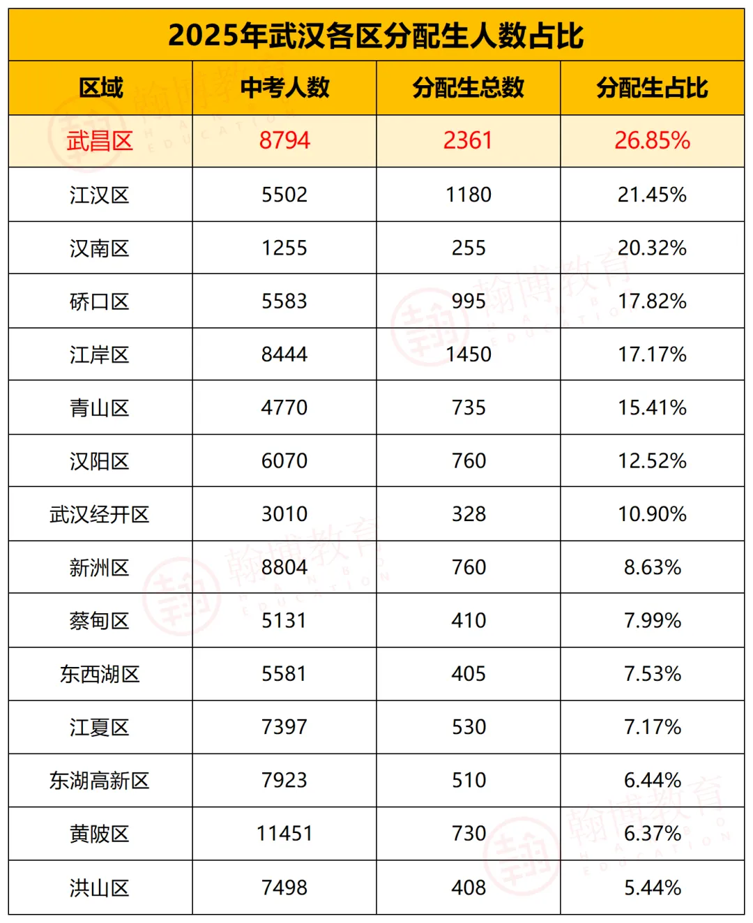 2025年武昌区中考参考人数8794人,分配生名额就有236人,占比高达26.85%。这个比例有多夸张?比第二名的汉南区高出6个多百分点,名额总量更是接近全市分配生总数的五分之一,含金量一目了然。