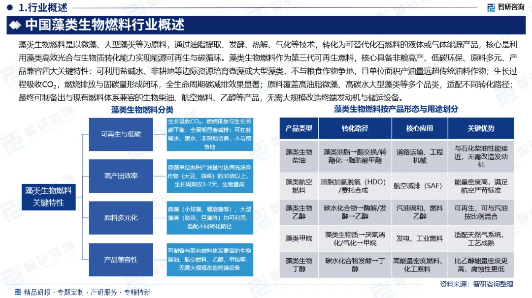 藻类生物燃料是以微藻等为原料转化而成的第三代可再生燃料,其核心优势在于可利用边际土地与废水进行非粮生产,彻底避免了与传统农业争地的矛盾,并具备显著的碳减排潜力。在全球推进碳中和与能源安全的背景下,该领域已成为交通航空等难减排行业的关键替代路径,全球市场正持续增长。我国已将藻类生物燃料纳入绿色发展战略,通过一系列顶层规划与产业政策,从技术研发到市场推广构建了全链条支撑体系。目前,行业正处于从“示范验证向规模化过渡”的关键阶段,在藻种基因编辑、AI智能培养、磁性絮凝采收等环节取得显著技术突破,并计划在渤海湾等地建设大型生产基地以推动产能提升。下游已形成以兼容性强的生物柴油为核心,航空燃料等高价值产品为辅的多元矩阵,市场规模增长可期。面向未来,中国藻类生物燃料行业的发展将依托技术集成持续降本增效,通过“能源+高值副产”的产业生态构建韧性,并在政策与市场双轮驱动下,重点向航空等高端领域规模化拓展,同时积极参与国际竞争,以提升全球竞争力。