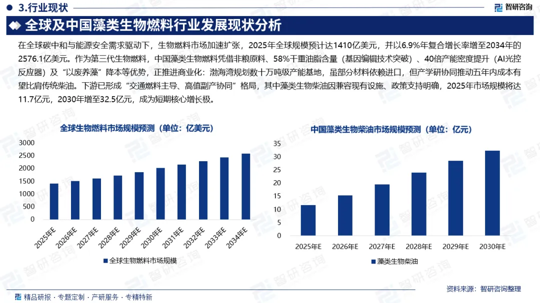 在全球碳中和与能源安全需求驱动下,生物燃料市场加速扩张,2025年全球规模预计达1410亿美元,并以6.9%年复合增长率增至2034年的2576.1亿美元。作为第三代生物燃料,中国藻类生物燃料凭借非粮原料、58%干重油脂含量(基因编辑技术突破)、40倍产能密度提升(AI光控反应器)及“以废养藻”降本等优势,正推进商业化:渤海湾规划数十万吨级产能基地,虽部分材料依赖进口,但产学研协同推动五年内成本有望比肩传统柴油。下游已形成“交通燃料主导、高值副产协同”格局,其中藻类生物柴油因兼容现有设施、政策支持明确,2025年市场规模将达11.7亿元,2030年增至32.5亿元,成为短期核心增长极。