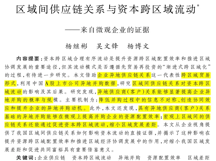 杨继彬,吴文锋,杨博文.区域间供应链关系与资本跨区域流动——来自微观企业的证据[J].经济研究,2025,60(11):121-143.