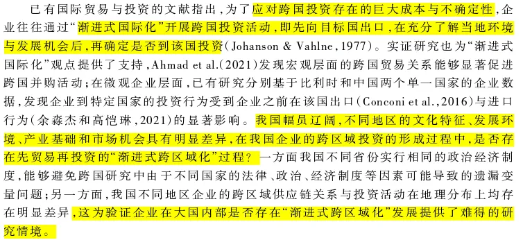 这篇论文的核心,是探究企业已有的跨区域供应链关系(即异地供应商或客户)是否会促进其进行跨区域并购。这背后关联着一个经典的国际商务理论——“渐进式国际化”,即企业通常先通过贸易熟悉海外市场,再决定是否进行直接投资。作者将这一理论视角“内化”到中国国内,提出了“渐进式跨区域化”的假说:企业是否会先与某个省份建立供应链贸易联系,然后再对该省份进行投资并购?