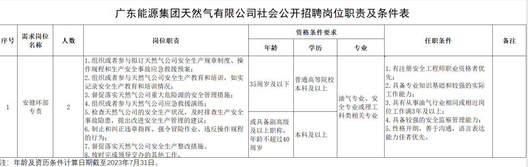 见《广东能源集团天然气有限公司系统内公开招聘岗位职责及条件表》(附件1)。