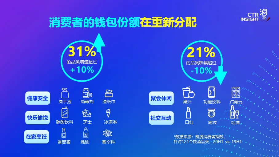 在整个市场的巨变背后是不同品类的钱包份额的重新分配。为消费者提供安全健康,快乐愉悦和在家烹饪的品类增长喜人,我们看到31%的品类都实现了超过10%的增长,而那些和社交休闲聚会相关的21%的品类,如饮料,口红等则受到了比较大的影响,跌幅超过10%。