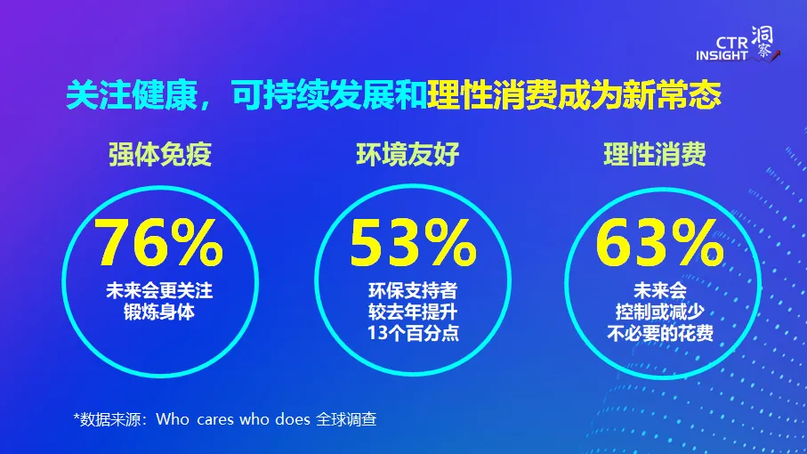 凯度消费者指数最新的Who Cares Who Does全球研究也指出,中国的环保支持者的消费者比例在2020年达到了53%, 比去年提高了13个百分点,显示了消费者对于可持续发展的关注。在未来收入不确定的情况下,消费者对于花钱也显得更加理性,63%的受访者认同未来会控制或减少不必要的花费。