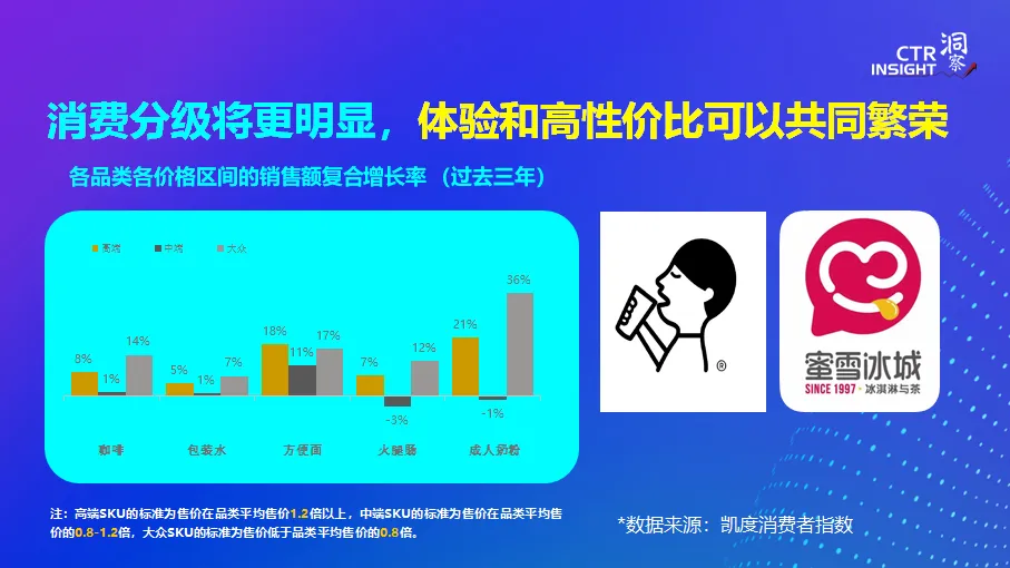 消费分级的概念在两年前已经提出来了,而今年消费分级会更加明显。凯度消费者的分析显示很多品类高端产品和大众化产品都呈现很好的增长,在价格定位居中的产品则销售停滞不前,受到很大的挤压。这一现象反映一方面高品质轻奢型的消费品仍然有旺盛的需求,但与此同时,一般的消费者在很多产品的购买上更趋理性,追求性价比。这就像喜茶和蜜雪冰城可以同时繁荣,极致体验和货比三家可以共存。中国市场的广度和宽度可以提供足够的空间给这两类竞争对手,但夹在中间的品牌的空间则在萎缩。