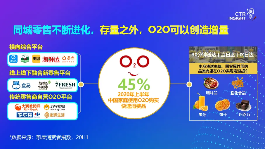 在疫情冲击下,2020年无疑是同城零售进化之年。虽然到家业务(O2O)已经有多年的发展,但一场疫情实现到家业务零成本的消费者交易,大大加速了消费者的接受程度。2020年上半年,中国城市有45%的家庭使用到家O2O方式购买快速消费品。而那些过去在电商上发展较慢的品类,如调味品,饮料,休闲食品等有望通过O2O模式实现弯道超车,进入数字化发展的快车道。
