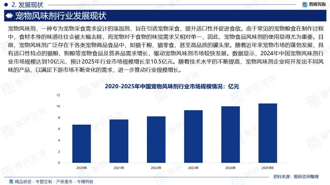 发展现状:随着近年来宠物市场的蓬勃发展,具有适口性特点的猫粮、狗粮等宠物食品及营养品需求增长,驱动宠物风味剂市场较快发展。数据显示,2024年中国宠物风味剂行业市场规模达到10亿元,预计2025年行业市场规模增长至10.5亿元。