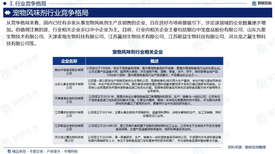 企业格局:国内已经有多家从事宠物风味剂生产及销售的企业,且在良好市场前景吸引下,涉足该领域的企业数量逐步增加。但值得注意的是,行业相关企业多以中小企业为主。目前,行业内相关企业主要包括烟台中宠食品股份有限公司、山东九象生物技术有限公司、天津麦海生物科技有限公司、江苏翼邦生物技术有限公司、江苏联益生物科技有限公司、河北宠之翼生物科技有限公司等。
