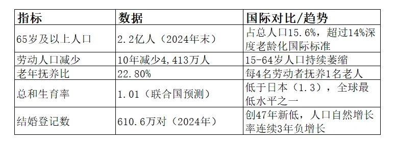关键洞察:中国正经历"未富先老"与"未备先老"的双重挑战。与发达国家不同,中国在人均GDP仅约1.3万美元时就已进入深度老龄化,养老储备明显不足。更严峻的是,婚育率持续走低意味着未来劳动力供给将进一步收缩,现收现付制的基本养老保险体系面临长期可持续性压力。