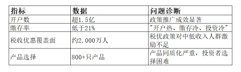 税收激励不足:每年1.2万元缴存上限对高收入人群缺乏吸引力,对低收入人群又无实际优惠(未达到个税起征点)