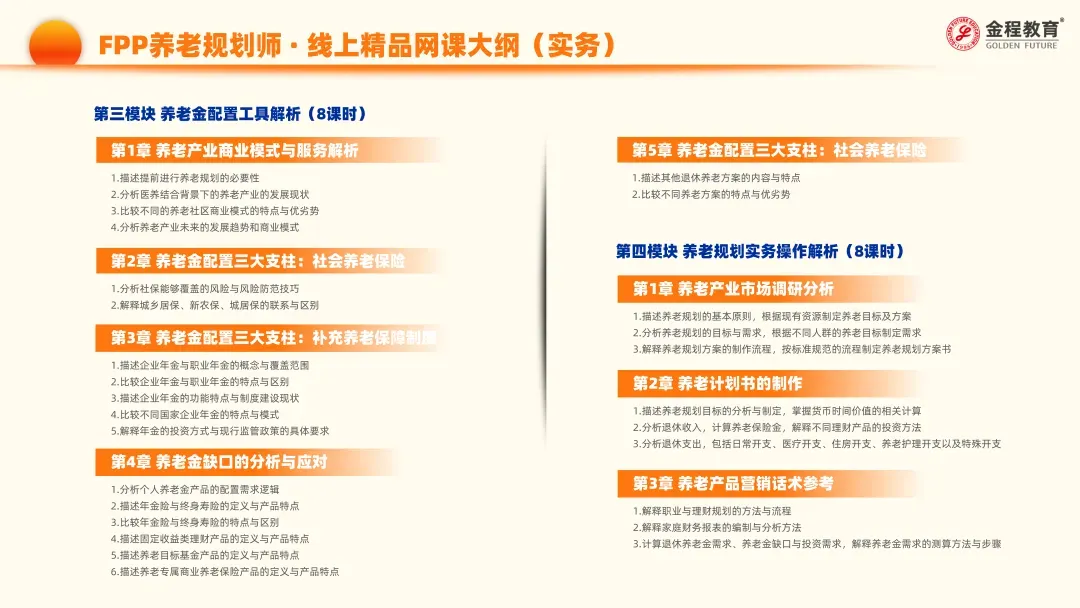 课程体系专业构筑:FPP构建“理论体系-工具应用-落地实战”三位一体知识框架,打造高净值客户养老规划服务的差异化竞争力。