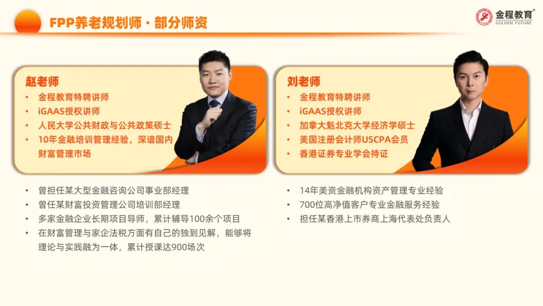 FPP养老规划师认证课程的师资普遍拥有10年以上行业实战与授课经验,团队成员均持有FPP、RFP等高含金量国际证书,多为协会特聘专家,曾服务于顶尖金融机构,并深度参与多家头部险企人才培养体系的研发,确保课程内容兼具国际视野与本土实战性,为学员提供系统且高效的专业赋能。