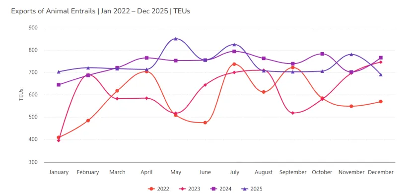 数据机构Datamar的数据显示,2025年全年,巴西共出口8875标准箱动物内脏,出口规模十分可观。下图为过去四年间,巴西此类动物内脏产品的月度出口量对比。