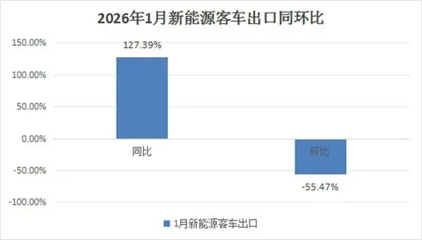 根据中国客车统计信息网统计数据,2026年1月我国新能源客车出口1237辆,同比呈现127.39%的翻倍大涨,环比呈现55.47%的下降幅度,可见环比降幅也不小。