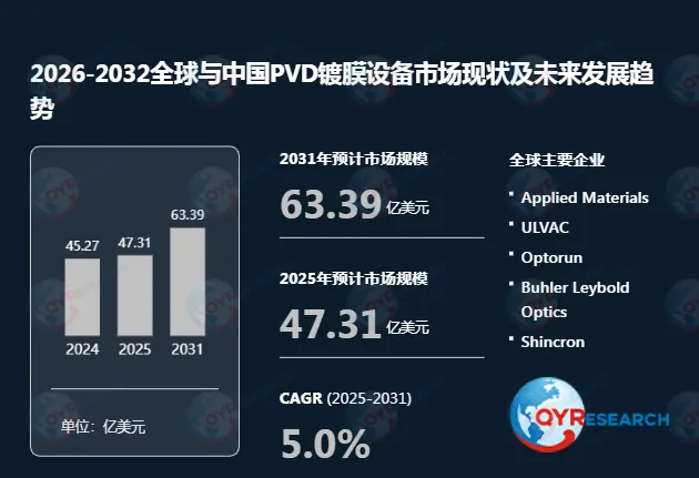 根据QYR(恒州博智)的统计及预测,2025年全球PVD镀膜设备市场销售额达到了47.31亿美元,预计2031年将达到63.39亿美元,年复合增长率(CAGR)为5.0%(2025-2031)。