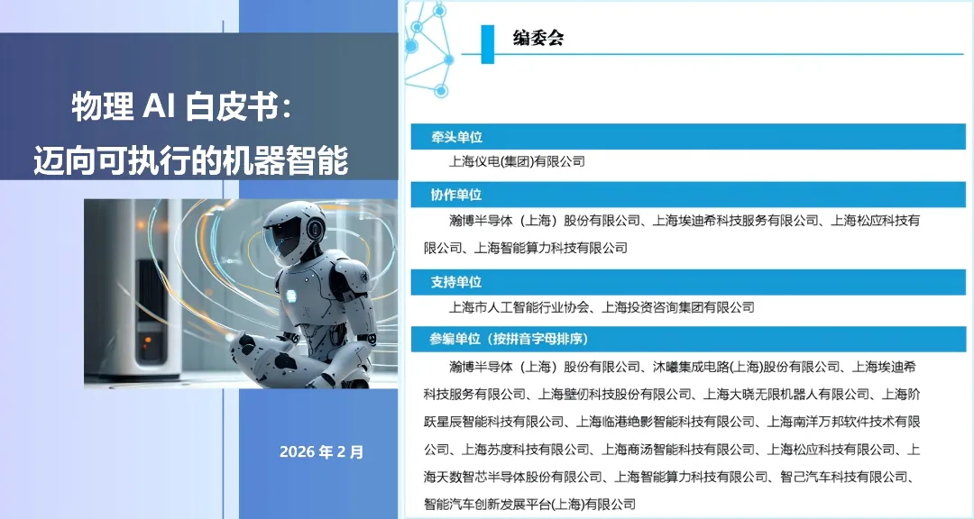 近日,由上海仪电(集团)有限公司牵头编制,联合瀚博半导体(上海)股份有限公司、上海埃迪希科技服务有限公司、上海松应科技有限公司、上海智能算力科技有限公司等多家单位,以及上海市人工智能行业协会、上海投资咨询集团有限公司等机构鼎力支持的《物理AI白皮书:迈向可执行的机器智能》正式发布。白皮书系统阐述了物理AI从“思考”到“行动”的技术路径与产业实践,为人工智能在真实物理场景中的规模化落地提供了系统性指引。