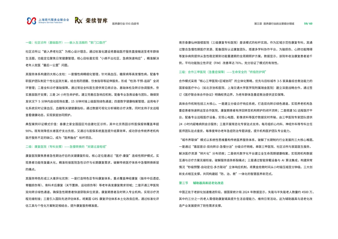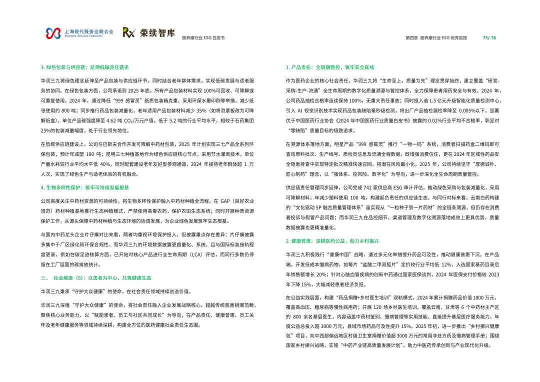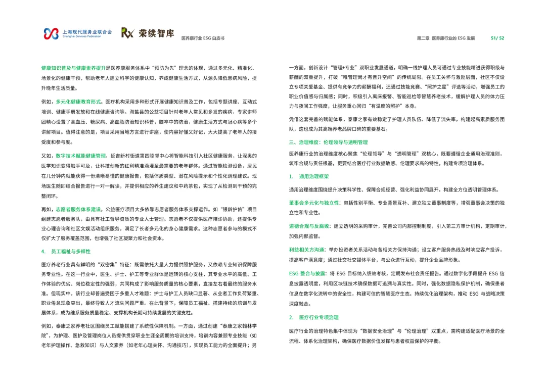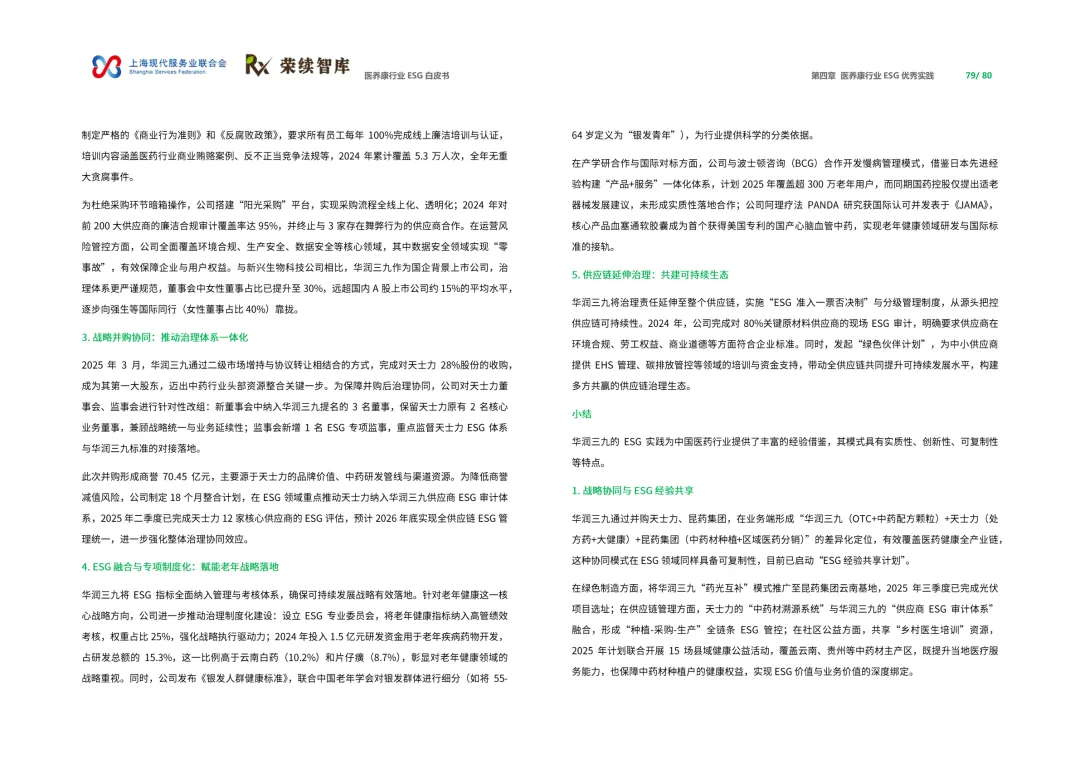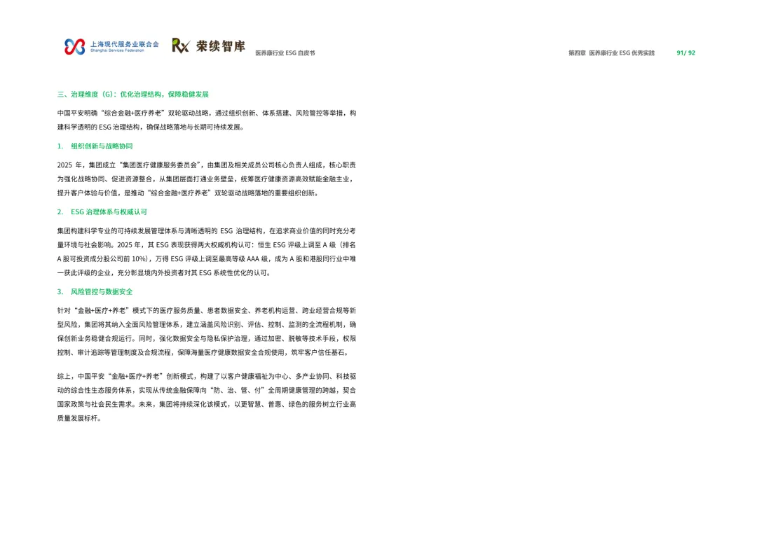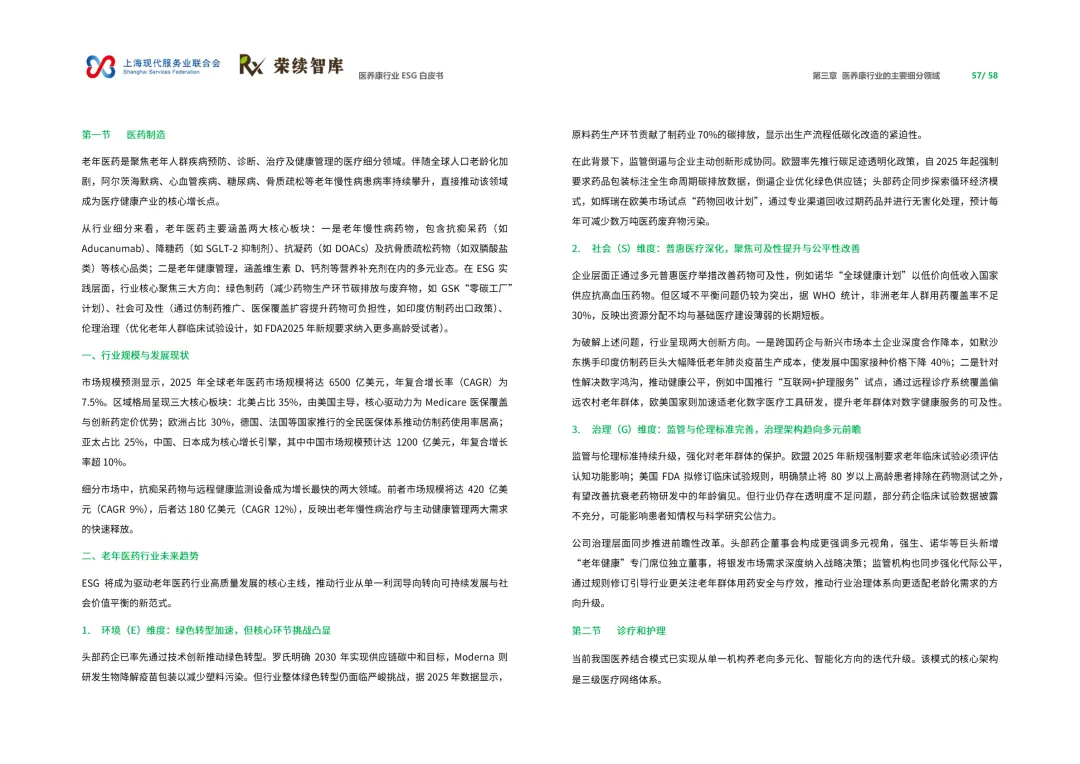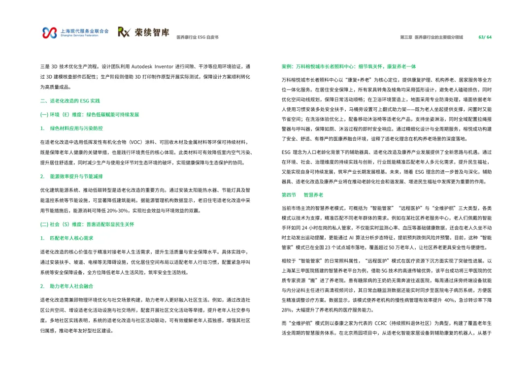 报告聚焦人口老龄化与健康中国战略背景,系统呈现行业可持续发展全景。白皮书涵盖行业概览、ESG 发展、细分领域及优秀实践四大核心板块,解析行业发展背景、价值链构成与国内外发展路径,梳理国内外相关政策支持体系。ESG 维度聚焦环境绿色转型、社会服务普惠、治理规范透明三大核心议题,环境端推进低碳运营与废物循环,社会端强化服务质量与健康公平,治理端完善伦理管理与数据安全。细分领域涵盖医药制造、诊疗护理、适老化改造、智慧养老,展现多元发展态势。白皮书收录翔宇医疗、华润三九等标杆企业实践案例,提炼可复制的行动经验,为政策制定者、产业经营者提供决策依据与行动路径,助力构建更具韧性与温度的医养康生态,推动产业价值与社会价值深度融合。
