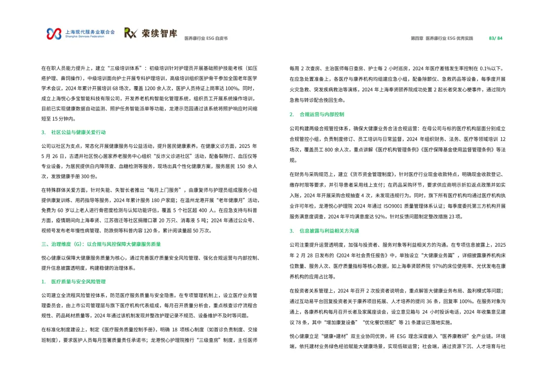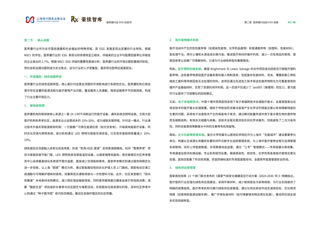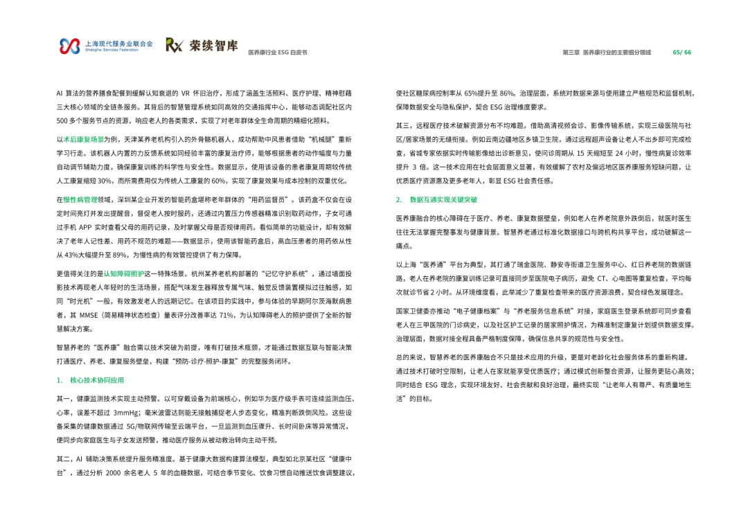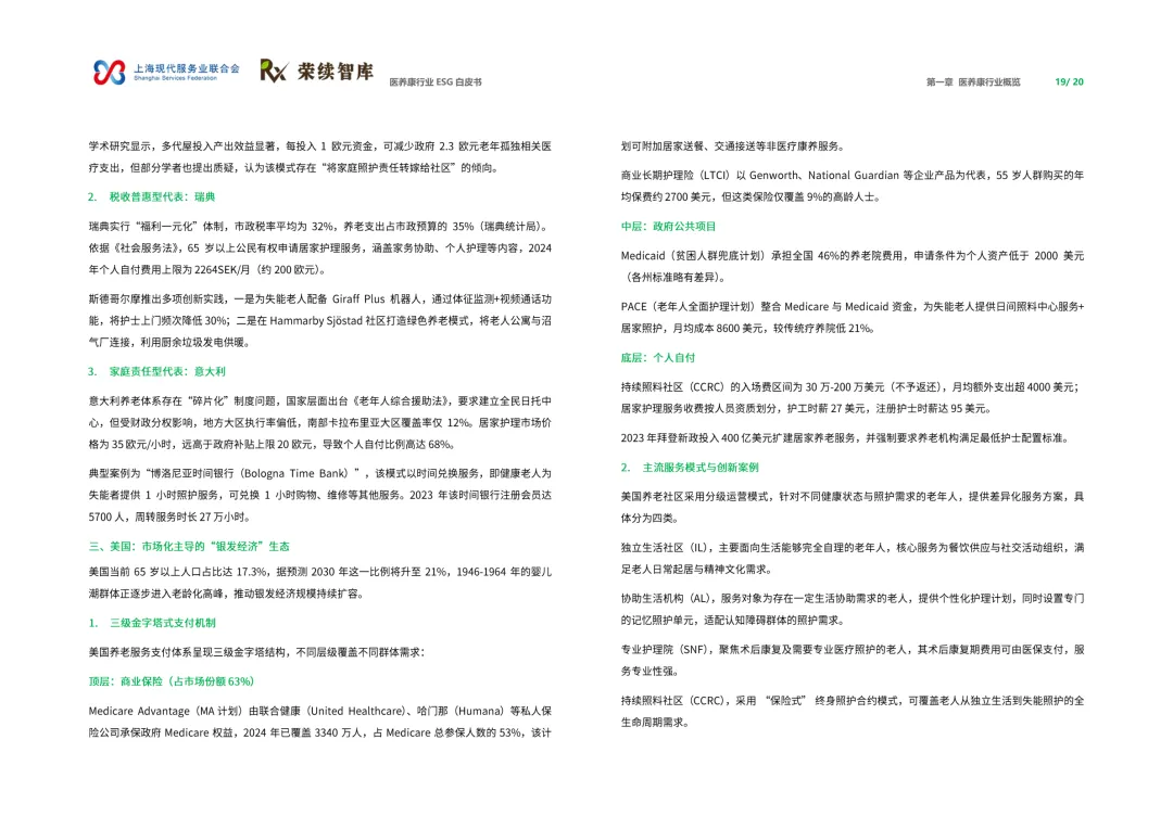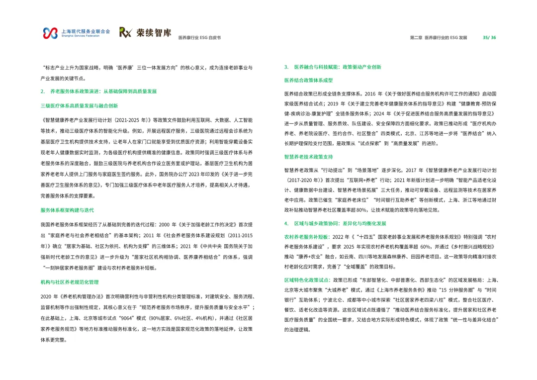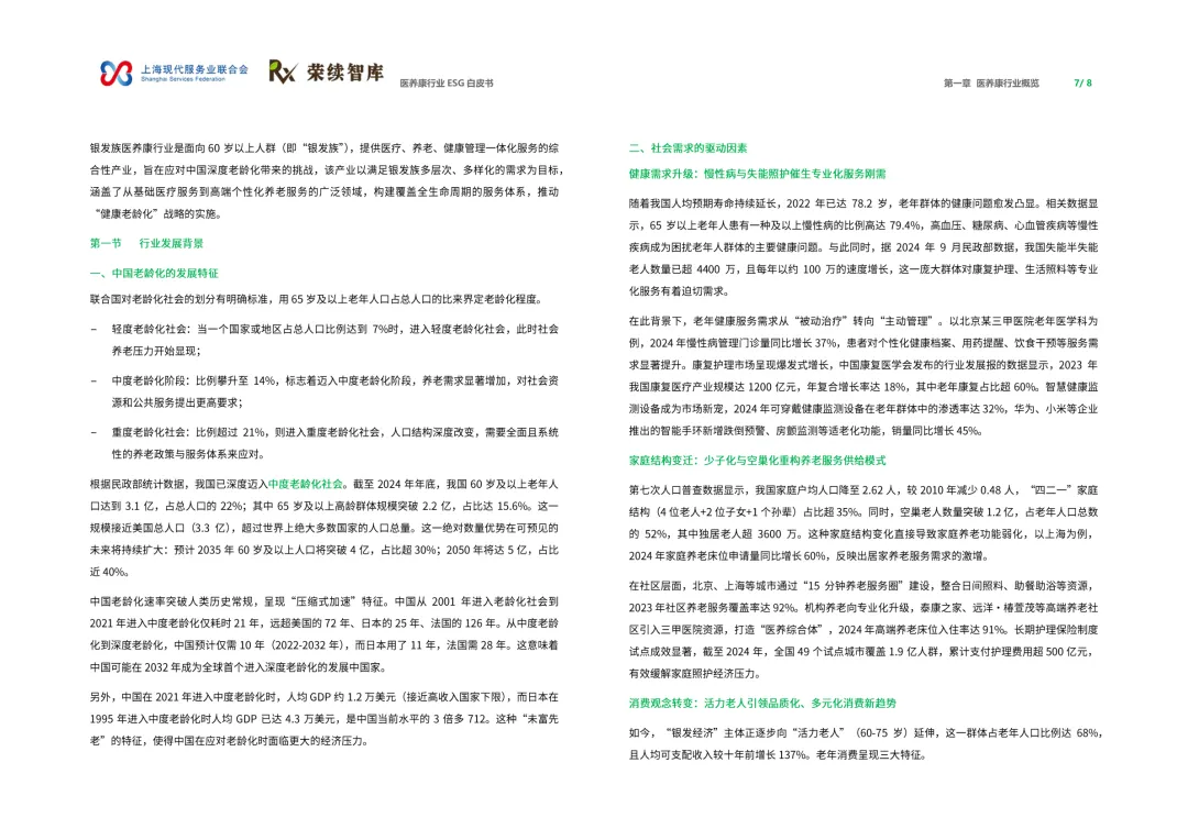 报告聚焦人口老龄化与健康中国战略背景,系统呈现行业可持续发展全景。白皮书涵盖行业概览、ESG 发展、细分领域及优秀实践四大核心板块,解析行业发展背景、价值链构成与国内外发展路径,梳理国内外相关政策支持体系。ESG 维度聚焦环境绿色转型、社会服务普惠、治理规范透明三大核心议题,环境端推进低碳运营与废物循环,社会端强化服务质量与健康公平,治理端完善伦理管理与数据安全。细分领域涵盖医药制造、诊疗护理、适老化改造、智慧养老,展现多元发展态势。白皮书收录翔宇医疗、华润三九等标杆企业实践案例,提炼可复制的行动经验,为政策制定者、产业经营者提供决策依据与行动路径,助力构建更具韧性与温度的医养康生态,推动产业价值与社会价值深度融合。