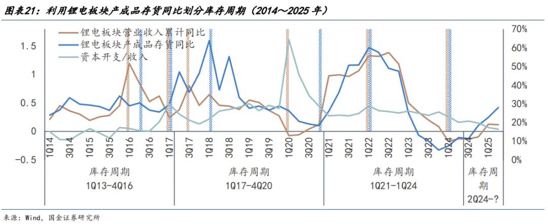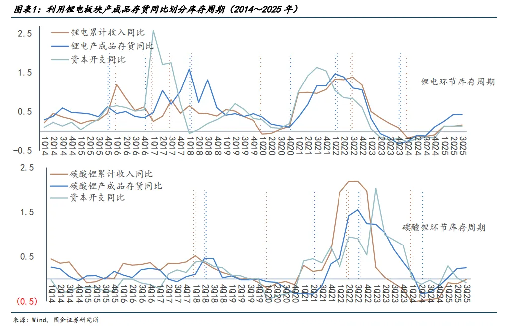 2025年,锂电新一轮扩产潮叠加固态技术突破驱动行业Capex加速,此外2023~2025年连续供给侧改革促进产能收敛,行业供需格局或开始出现反转,部分环节呈现涨价潮,产业链景气度多元开花。(一)周期:2025~2026年锂电中游步入“复苏-繁荣”阶段,对应板块补库。锂电板块正经历库存周期触底至回升阶段,1Q22-1Q24板块结束2年下行周期后2Q24开始回升;3Q25,锂电板块收入累计同比16%、产成品存货同比为42%,收入及存货同方向上行为板块“主动补库”阶段(繁荣期),延续1Q24起新一轮库存周期向上趋势。