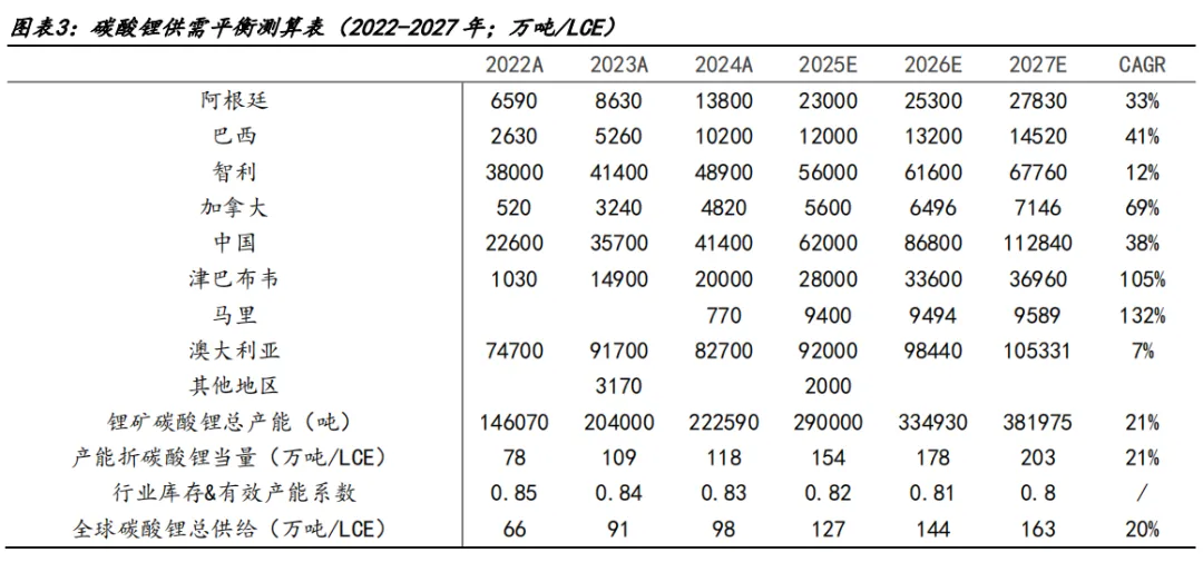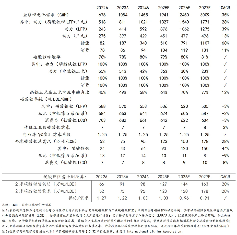 我们假设:2025~2027年,①锂矿和盐湖产能爬坡释放,进入集中放量期。其中,非洲矿为核心增量;②考虑电池能量密度提升及生产工艺优化,单位GWh的碳酸锂单耗按年均0.97的系数逐年递减;③考虑到行业高成本产能逐步出清及库存管理趋于理性,设定行业库存及有效产能系数由2022A的0.85逐年递减至2027E的0.80;④根据SMM新能源统计,磷酸铁锂路径在动力电池中的占比持续提升,从2022A到2027E分别为47%/51%/58%/66%/69%/72%,而中低镍三元的渗透率随技术路径优化逐年缩减。得出结论:2025~2027年,①需求增速反超供给:2022~2027年供给端年复合增长率为20%,而需求端CAGR达28%; ②供需缺口收窄:全球碳酸锂供需比将从2025年的1.03降至2026年的0.96,由供给过剩转向实质性紧平衡,供需错配叠加高成本产能出清,将支撑碳酸锂价格进入温和修复区间。此外,我们认为本轮碳酸锂周期向上核心支撑逻辑在于行业库存水平处在低位,而2022~2025年由于碳酸锂价格上涨导致行业库存从底部飙升至新高,碳酸锂下行时库存被动抛售形成额外供给,造成实际过剩程度加剧。当前行业库存已回落至历史低位,供需错配关系下价格抬升亦更加敏感。1.2 动储经济性测算:18~20万元/吨碳酸锂价格或为需求敏感分水岭