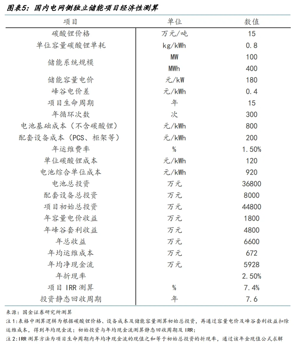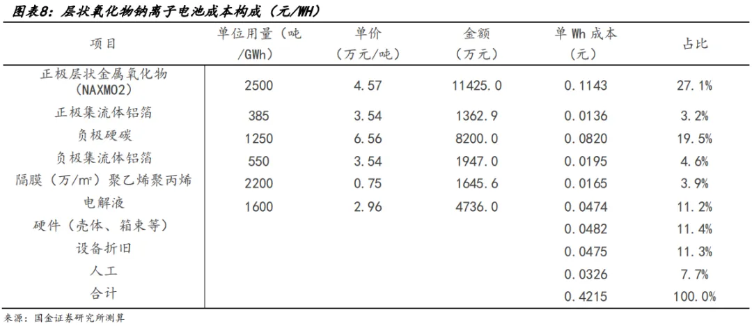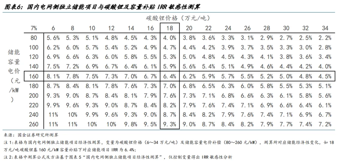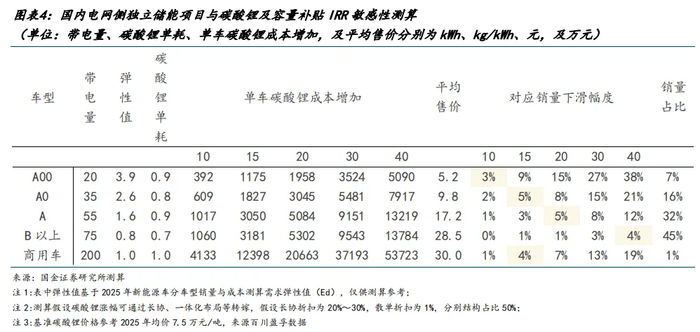 国内新能源车价格销量敏感性分析:我们测算不同车型对于价格敏感度测算碳酸锂涨价趋势下对于总量影响,假设A00/A0/A/B以上/商用车:①带电量,分别20/35/55/75/200kWh;②需求弹性值(Ed),分别3.9/2.6/1.6/0.8/1.0,根据2025年价格与需求变化测算假设;③碳酸锂单耗,分别0.9/0.8/0.9/0.7/1.0kg/kWh。测算得出,以5%销量下滑作为基准线,A00/A0/A/B以上/商用车对应碳酸锂价格分别10/15/20/40/15万元/吨,此外考虑各车型销量占比预期,20万元/吨碳酸锂价格对应新能源车总量下滑幅度预计为4%。国内电网侧独立储能项目经济性测算:考虑全国储能容量补贴政策,我们测算不同碳酸锂价格对于储能经济性影响,以100MW/400MWh 4小时项目为例,基于15万元/吨碳酸锂价格,假设峰谷电价差为0.4元/kWh、项目生命周期15年、年循环次数300次,及容量补贴电价为180元/kW每年等,测算该项目IRR为7.4%;若考虑不同碳酸锂价格,敏感性测试得出160元/kW容量补贴基准下,按照6.5%IRR作为国内储能项目装机经济性底线,测算碳酸锂价格为18万元/吨。1.3 钠电池:长期成本优势明确,产业化进程预加速