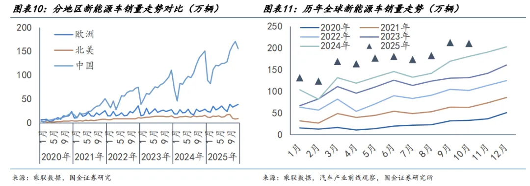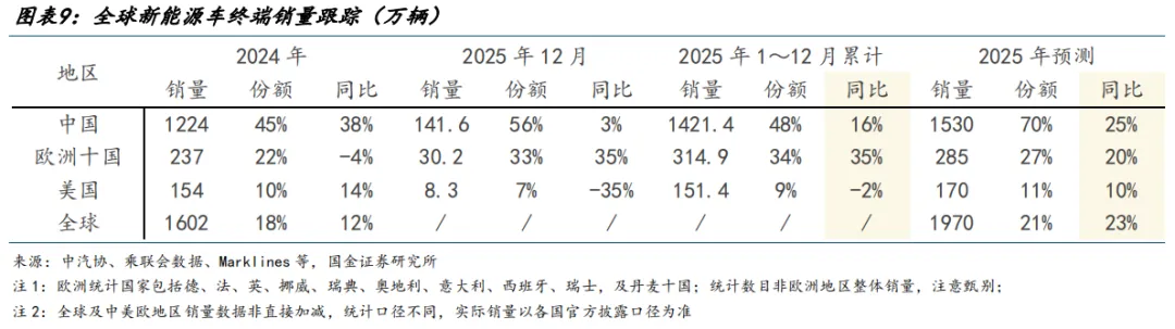 新能源车:12月全年收官延续分化,欧洲领跑、中国稳健、美国承压2025年12月,全球新能源车市场表现再度超预期,尤其国内及欧洲市场强劲增长,美国市场呈现下降趋势。据乘联会等数据,12月中国/欧洲十国/美国新能源车销量分别达到142/30/8万辆,同比增速分别+3%/+35%/-35%,渗透率达56%/33%/7%。我们在2025年中期策略中预测,2025年中国/欧洲/美国/全球新能源车增速预计分别为25%/20%/10%/23%。2025年1~12月,中国销量累计同比增速达16%,略低于预测值,“两新”政策持续发力,第三批补贴于7月份下达,以及“金九银十”新车密集投放,共同推动国内销量持续平稳增长。欧洲十国1~12月累计同比增速达35%,远超预期,主要受多国政策补贴窗口期推动:意大利电车补贴于10月22日正式落地,12月新能源车销量同比激增132%。挪威政府2026年1月起上调电动车相关税费,引发“抢装潮”,消费者在年底集中购车,全国汽车销量同/环比激增165%/77%。德国于2026年1月重启电车补贴计划,对售价低于4.5万欧元的电车提供最高4000欧元的补贴,有望对2026年德国电车销量形成支撑。与此同时,美国新能源汽车市场因联邦税收抵免政策的重大调整而遭遇逆风。2025年9月30日起,购买电动汽车的消费者将不再能获得高达7500美元的联邦税收抵免,对消费者购买意愿造成直接冲击,导致10月起销量持续同比负增长。12月销量同比虽下降35%,但在车企年底冲量促销下,环比增长27%,呈现“同比降、环比升”的政策退坡后特征。动力电池销量&出口:根据ABIA数据,2025年12月我国动力电池销量144GWh,环比+7%,同比+49%;1~12月累计销量12019GWh,累计同比+52%。动力电池出口19GWh,环比-10%,同比+47%;1~12月累计出口190GWh,累计同比+42%。