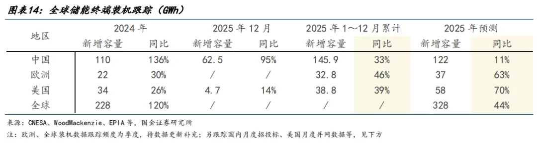 储能:12月中美并网冲高,欧洲全年保持高增。12月国内装机为63GWh,同/环比+95%/+441%,主因年底项目集中并网冲刺;1~12月累计装机146GWh,累计同比+33%,行业在目标牵引与成本下降下步入“市场驱动”轨道。欧洲全年累计新增33GWh,同比+46%,高增主要系英国及德国等地公用事业级大型项目集中交付,及峰谷价差提升项目经济性等。美国12月储能并网5GWh,同/环比+14%/+97%,属年末周期性冲高;1~12月累计装机39GWh,累计同比+39%,增长低于预期值,市场因《大而美法案》带来的长期不确定性增长放缓。