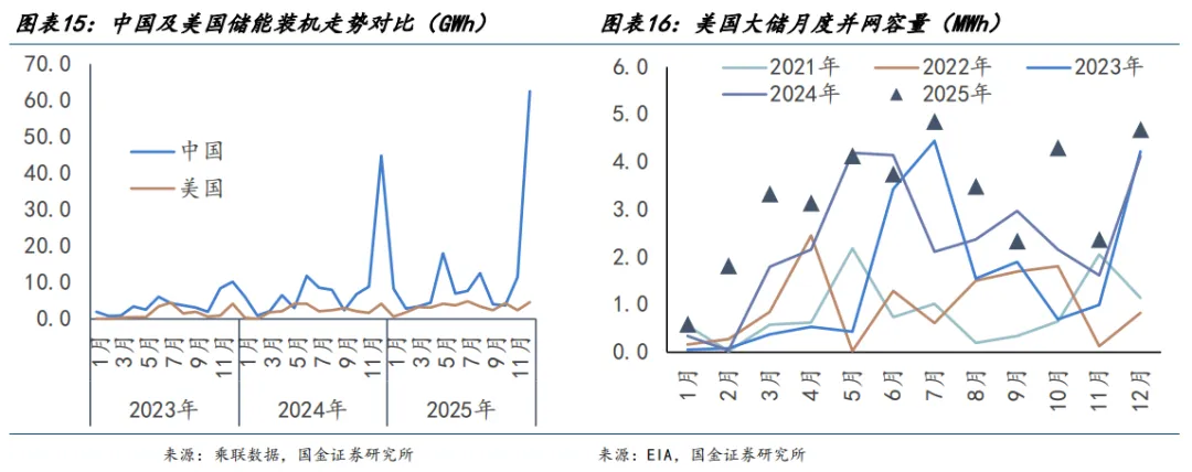 2025年12月国内装机为63GWh,同比+95%、环比+441%;1~12月累计装机146GWh,累计同比+33%。12月国内储能新增装机环比暴涨,是年底项目集中并网冲刺与市场驱动模式深化的共同结果,印证了在《新型储能规模化建设专项行动方案》目标牵引下,地方规划密集落地、容量电价等机制完善以及系统成本大幅下降带来的经济性提升,共同推动行业已步入“政策引导下的市场驱动”可持续发展轨道。我们在2025年中期策略中预测,中国/欧洲/美国/全球新增容量的同比增速分别为11%/63%/70%/44%。2025年1~12月国内累计同比增速达33%,显著高于预测值。欧洲全年累计新增33GWh(全欧洲口径,含欧盟27国及英国、挪威、瑞士等非欧盟国家),同比+46%,较预期增速接近;欧洲装机高增主要系英国及德国等地公用事业级大型项目集中交付,及峰谷价差提升项目经济性等。美国12月储能并网5GWh,同比+14%、环比+97%,主要受年底项目集中投运驱动;1~12月累计装机39GWh,累计同比+39%,低于预测值,印证了市场自下半年起增长动能已显著放缓,进入平台期。这表明12月的环比反弹属于周期性年末冲刺,并未改变由《大而美法案》带来的供应链重构、本土化要求细则不明朗等长期政策不确定性所引发的市场整体调整态势。未来增长有待于政策细则明确与供应链适应新规后的企稳。储能系统招标:根据高工产研数据,2025年11月国内EPC及储能系统中标规模为21GWh,同比+87%、环比-18%;1~11月累计同比+165%。EPC中标价格为1095元/kWh,较上月基本持平;储能系统中标价格为549元/Wh,环比-1%,随着年底并网节点临近,市场多进入项目建设与调试阶段,前期招投标工作已基本收官,11月招标规模的环比下滑,是招中标市场随项目建设周期进行应季调整的直接体现。同时,在《新型储能规模化建设专项行动方案(2025~2027年)》等国家级量化目标的强力驱动下,市场需求具备长期确定性,推动市场规模仍远超去年同期。