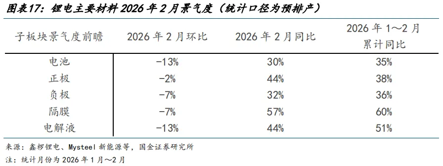 锂电排产:2月进入传统淡季,环比下滑2%~13%,同比增长30%~57%。2026年2月,电池/正极/负极/隔膜/电解液预排产累计同增35%~60%,其中隔膜、电解液同比超50%;各环节排产环比小幅回落,主要系受春节假期影响排产小幅下调,但全产业链仍维持高景气度。