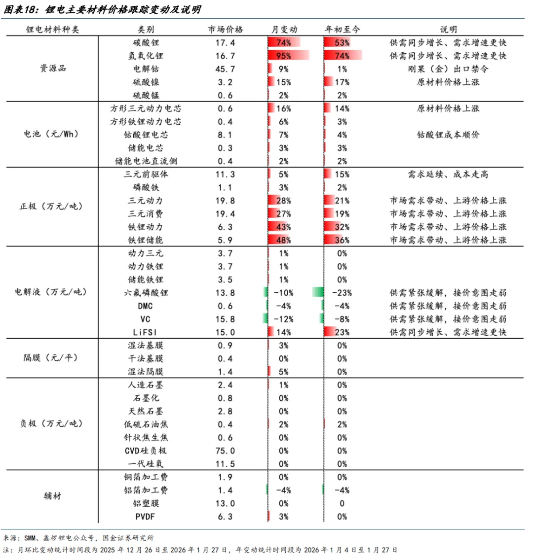 2月锂电排产跟踪:进入传统淡季,环比变动-13%~-2%,同比增长30%~57%。2026年2月,电池/正极/负极/隔膜/电解液预排产累计同增35%~60%,其中隔膜、电解液同比超50%;各环节排产环比小幅回落,主要系受春节假期影响排产小幅下调。但全产业链仍维持高景气度,同比增长维持在35%~60%的高区间。锂盐与正极材料受政策退坡驱动强劲领涨,电解液相关原料如六氟磷酸锂、VC、DMC因供应缓解有所回调。受电池出口退税退坡引发的“抢出口”及阶段性补库需求驱动,碳酸锂与氢氧化锂月涨幅分别达74%和95%,倒逼磷酸铁锂等正极材料因成本压力大幅跟涨;电解液环节虽成品价稳,但因处于行业传统需求淡季且受供应增加和长单谈判影响,核心原料六氟磷酸锂、VC、DMC价格出现4%~12%的小幅回落。碳酸锂:根据SMM新能源,1月碳酸锂月涨幅达74%,延续上涨态势。从需求端看,由于出口退税政策退坡带动“抢出口”需求,下游新能源汽车及储能市场的需求增速远超预期。虽然供应端同步增长,但受原材料价格剧烈波动影响,上游锂盐厂惜售情绪逐渐增,挺价意愿强烈,市场成交价格快速抬升。下游材料厂虽持谨慎观望态度,但仍结合排产计划进行刚需及长协采购,碳酸锂价格将延续高位态势。