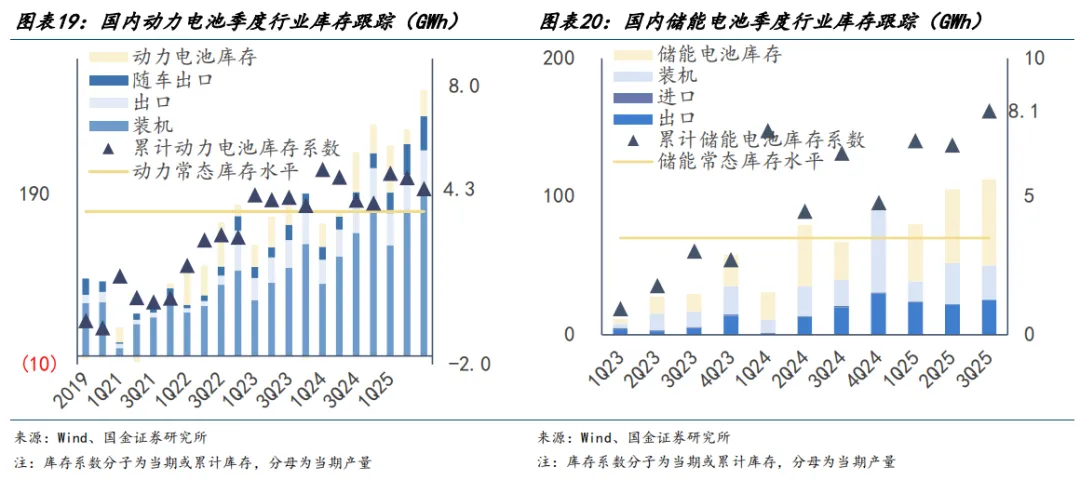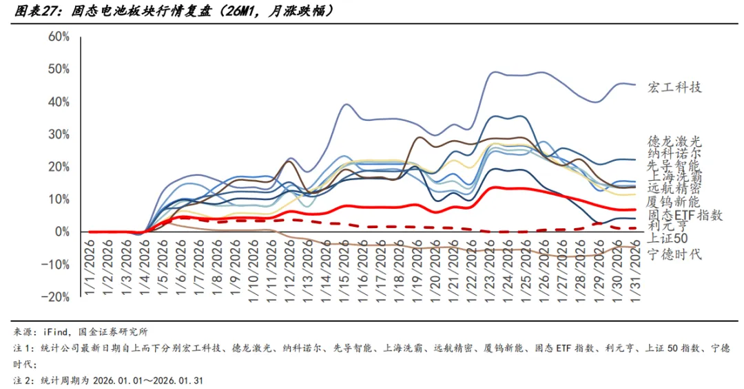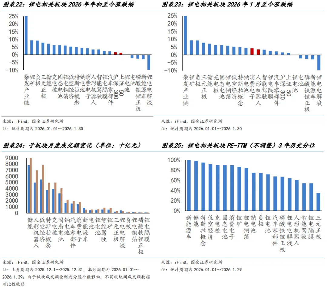 2025年三季度动力、储能电池库存水平分别回落、抬升。我们通过终端装机及电池产销量、进出口数据测算行业库存水平,动力电池库存呈现回落态势,3Q25动力库存系数测算为4.3(常态水平为3.5),较2Q25继续回落。动力库存下降主要系国内新能源车销量景气度较高,且出口动力电池保持高增。同期,储能电池库存自2Q25小幅下滑后呈现回升态势,3Q25储能库存系数测算为8.1(常态水平为3.5),主要系产量保持增长,然而国内装机存在时滞性或品类统计不完全、集成商提前备库等导致库存水平抬升。板块所处库存周期阶段:我们在2024年~2025年策略报告中即提到,锂电板块正经历库存周期触底至回升阶段,当前板块自2Q24正式进入复苏阶段,3Q24~2Q25为板块繁荣期,对应库存周期为“被动去库”至“主动补库”阶段。2.4 新技术:固态电池产业化进程全面加速,2025年迈入规模化应用元年本月关注固态电池产业化加速,2025年正成为规模化应用元年,预计全球出货达36GWh,其中半固态电池于高端电动车型实现批量装车,全固态电池中试线密集投建。产品端,宁德时代凝聚态电池能量密度达500Wh/kg并已量产,辉能科技全固态电池通过车规测试;车企端,丰田计划2027年量产全固态电池,蔚来半固态电池包已交付;材料端,硫化物固态电解质规模化制备取得进展,成本下降路径明晰。产业链上下游合作深化,预计2030年全球固态电池出货量有望达到614GWh(伊维经济研究院预测),技术代际更替进程显著提速。2026年年初至今,锂电板块基本面表现较为活跃,多数环节跑赢沪深300和上证50指数。关联板块中,柴发产业链、锂矿和负极等环节涨幅靠前,相对沪深300的涨跌幅分别为25.6%、9.4%和9.3%。2026年1月以来,多数板块实现上涨,其中柴发产业链板块实现领涨,涨幅达25.6%;锂矿、负极、三元正极、储能涨幅随后。本月受下游客户订单缩减的影响,锂电电解液板块出现一定程度下跌,下跌9.8%。本月锂电相关板块多数环节月度成交额上涨,其中低空经济和人形机器人涨幅最高,高达44%和40%;而新能源车和锂电电解液成交额出现下降,跌幅分别达到30%和22%。这主要体现了市场对锂电产业链的关注点正在从传统动力应用向更具想象空间的新兴终端迁移。月度板块估值:本期过半锂电相关板块的3年历史估值分位处于高位,其中新能源车、储能、特斯拉概念、低空经济、充电桩、固态电池、消费电子、锂矿、锂电电箔的3年历史估值超过80%。