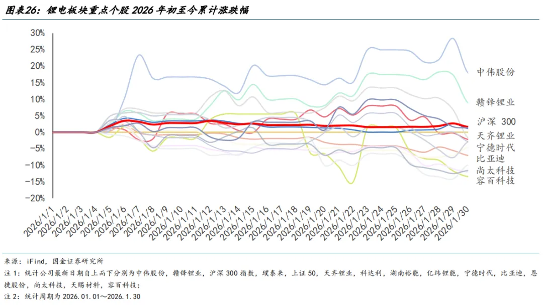 2026年年初至今,板块重点公司中伟股份(+18.22%)、赣锋锂业(+9.08%)、璞泰来(+1.35%)、股价上涨并跑赢上证50指数(1.17%);而较多公司股价出现下跌,天齐锂业(-1.50%)、科达利(-2.13%)、湖南裕能(-2.75%)、亿纬锂能(-3.00%)、宁德时代(-4.70%)、比亚迪(-6.99%)、恩捷股份(-9.98%)、尚太科技(-11.61%)、天赐材料(-12.13%)、容百科技(-13.42%),主要系锂电产业链供需关系仍处于筑底出清阶段,材料端价格竞争持续加剧,导致企业盈利预期受损。
