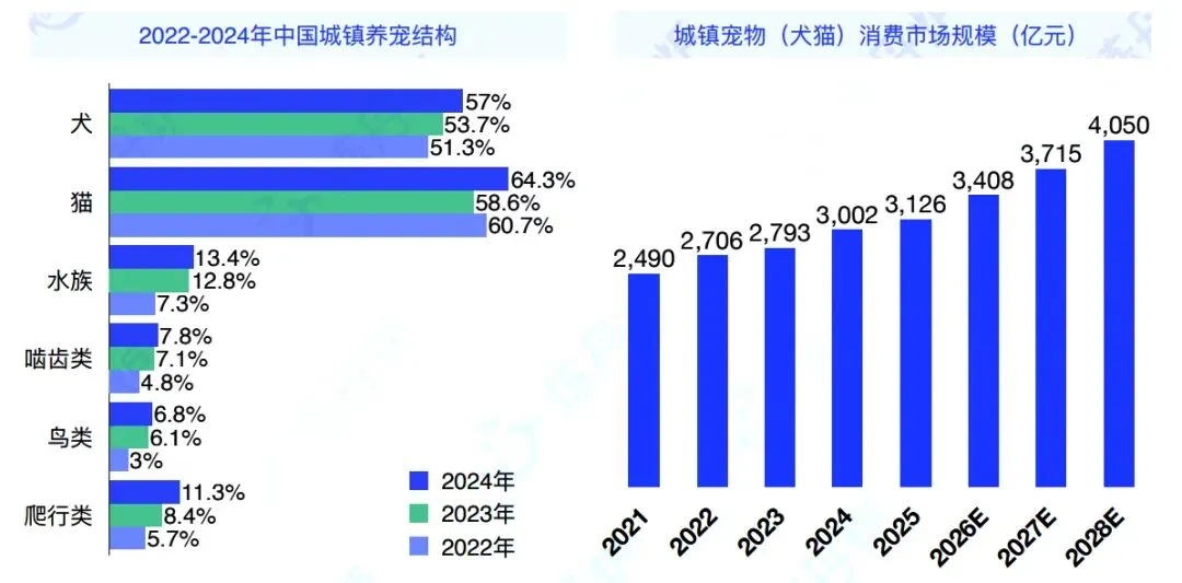 养宠结构呈多元化趋势,情感需求驱动市场扩容。据白皮书数据,2025年城镇犬猫消费市场规模达3126亿元,同比增长4.1%;预计2028年,犬猫消费市场规模将达4050亿元,成为行业增长核心支柱。