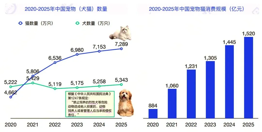 宠物猫数量激增,猫经济超千亿成行业增长核心;宠物犬受禁养扩容、条款趋严影响,增长放缓趋稳。2025年城镇犬5343万只、猫7289万只,猫数量及消费增速均领先犬类。