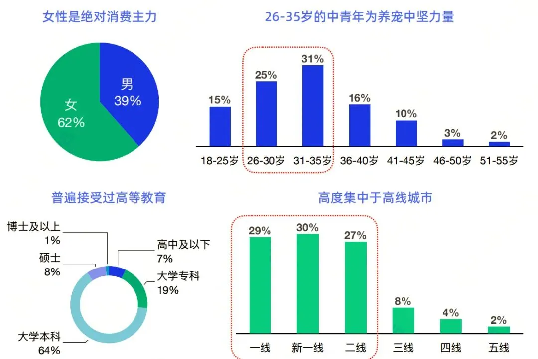 人群属性:高知女性主导养宠决策,26-35岁中青年为消费中坚;养宠场景聚焦一线、新一线城市,高线城市养宠渗透率显著高于下沉市场。