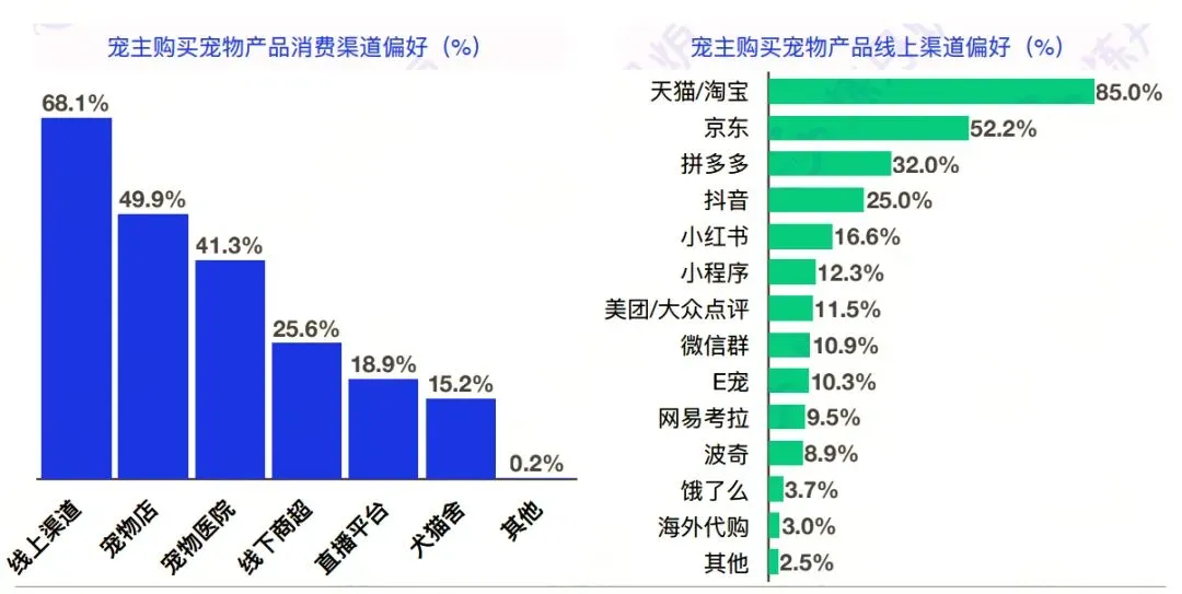 线上渠道为宠物主消费首选,天猫/淘宝、京东为核心偏好平台,线上