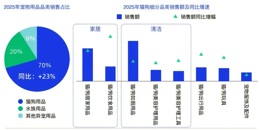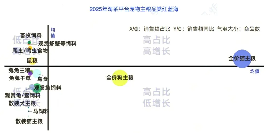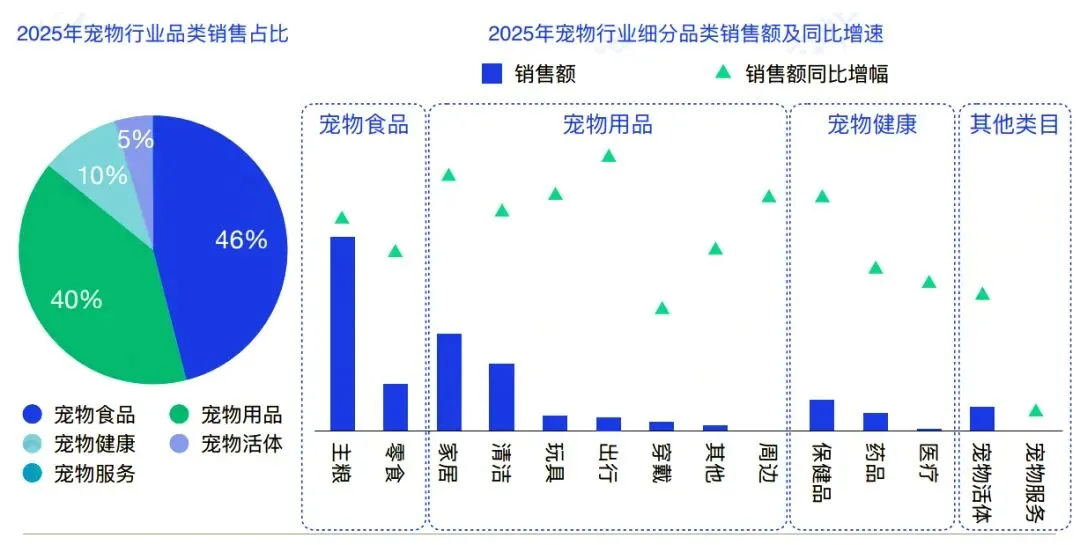 品类格局:猫狗主粮占主导,小众异宠(爬宠、水族等)为新兴增长点,增速亮眼。