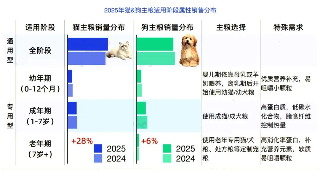 细分亮点:通用型主粮为基础选择,老年期专用主粮为增长核心,需求持续攀升。