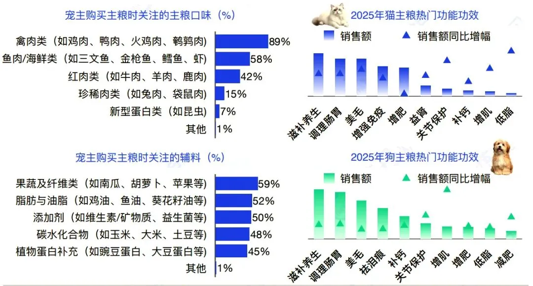 升级方向:主粮向高工艺、功能化、新鲜度升级,低温烘焙、鲜肉及功能粮需求激增,定制化趋势显现。