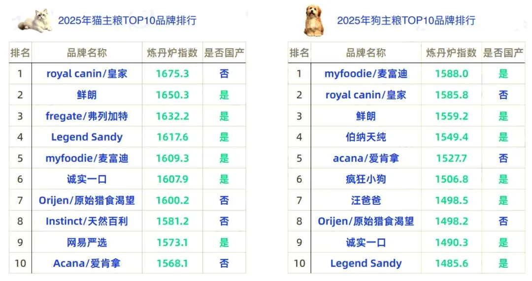 原料与品牌格局:原料以禽肉+果蔬为主;猫粮市场国际品牌领先、国产品牌追赶,狗粮市场国产品牌主导,国产化趋势显著。
