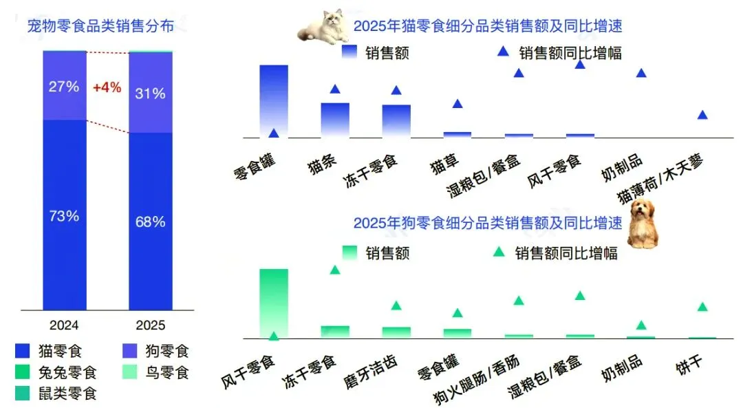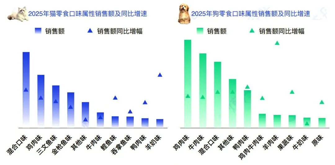 口味偏好:猫零食倾向混合风味,狗零食偏好鸡肉、牛肉等单一肉源口味。