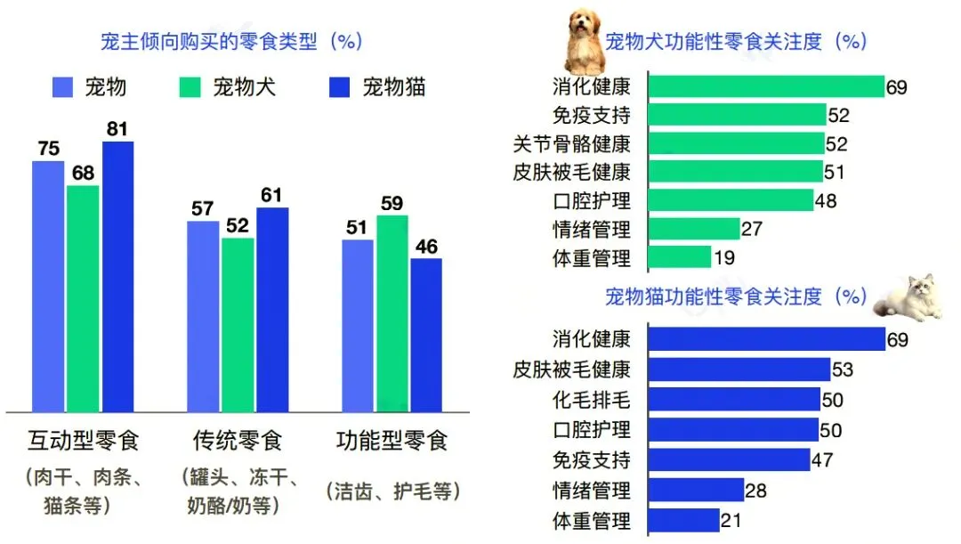 功能化趋势:功能化凸显,消化健康为核心需求,护关节等功能零食增速快;犬主更重视功能性,猫零食侧重口感互动,狗零食侧重功能适配。