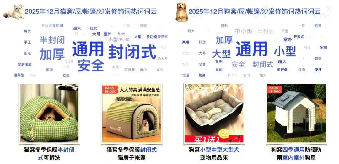 品类差异:猫窝侧重封闭性,狗窝侧重尺寸适配、通用性及耐咬易清洁。