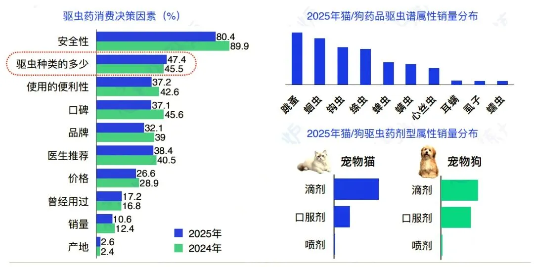 选择偏好:驱虫药选择兼顾安全与全面,猫用以外用滴剂为主,犬用剂型多元。