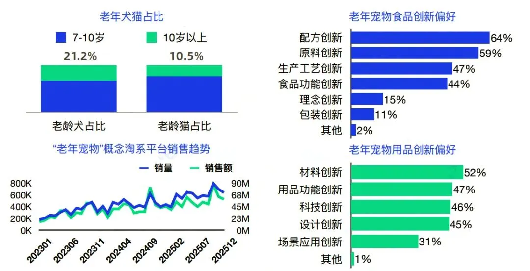 老龄宠物市场空间广阔,犬老龄化程度更高,核心需求聚焦健康、功能、安全,属高潜力赛道,未来增长可期。