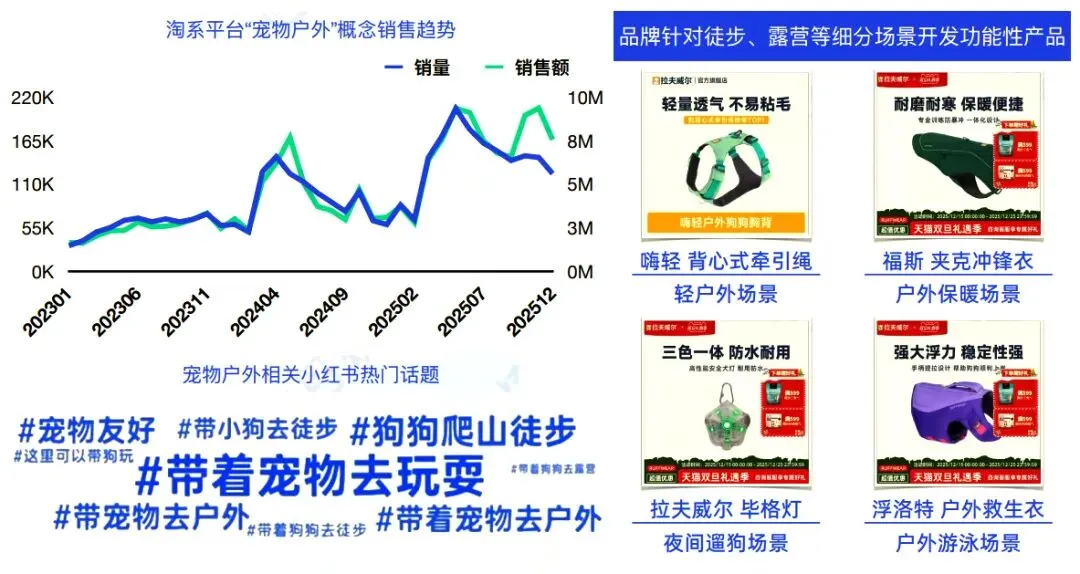 宠主携宠户外、旅行增多,宠物成户外“时尚单品”,推动户外用品及场景拓展、相关品类发展,成为宠业新增长亮点。